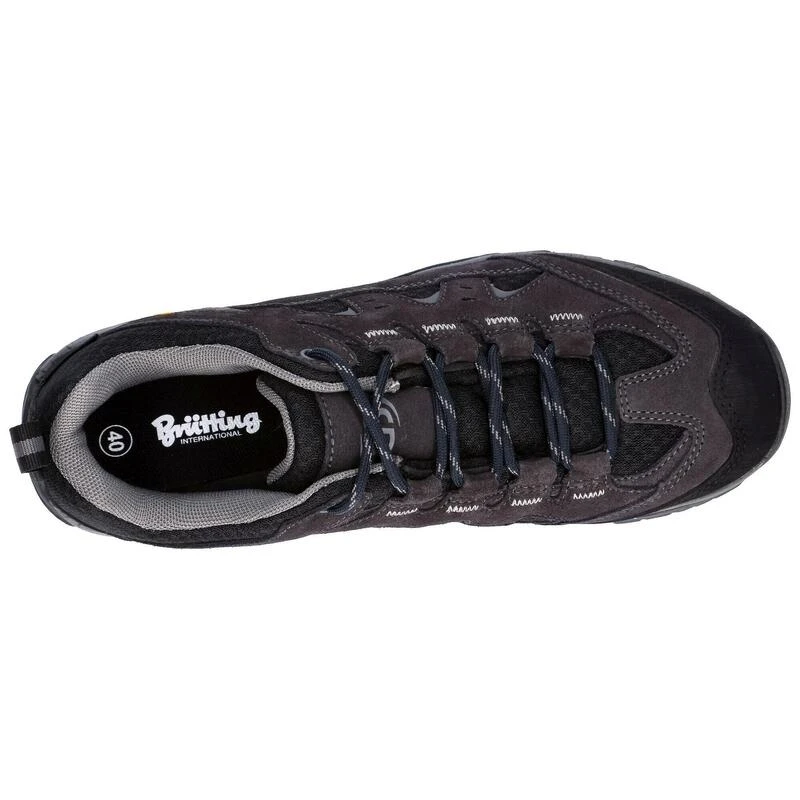 Waterdichte outdoorschoen Mount Bear Low van Brütting gemaakt van suède met nylon inzetstukken en vetersluiting. Waterdicht en ademend Comfortex-klimaatmembraan. Comfortabele voering van textiel en vervangbare Ortholite binnenzool van textiel. Stevige en antislip Vibram buitenzool.